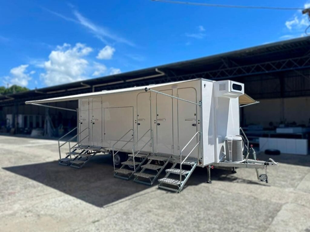 Trailer de luxo com 10 cabines individuais, equipado com vasos sanitários, pias, espelhos, iluminação e ventilação. Ideal para eventos que exigem conforto, higiene e sofisticação para os convidados.